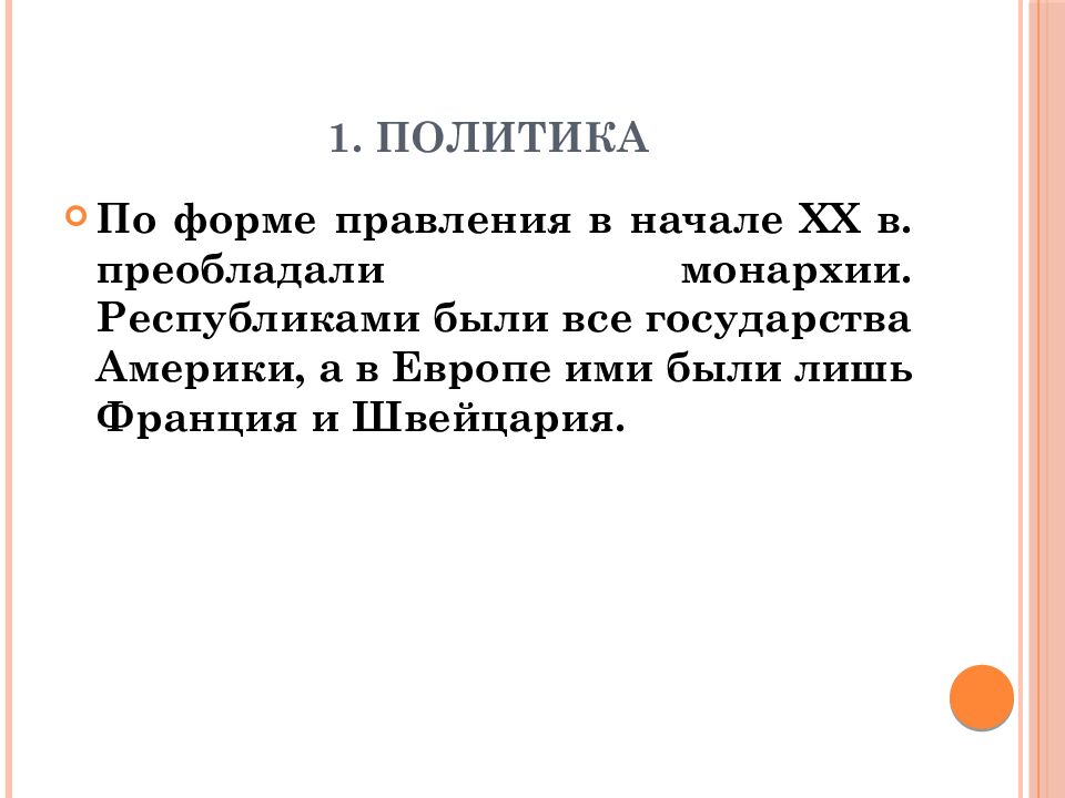По форме правления в начале ХХ в. преобладали монархии. Республиками были все государства Америки, а в Европе ими были лишь Франция и Швейцария.