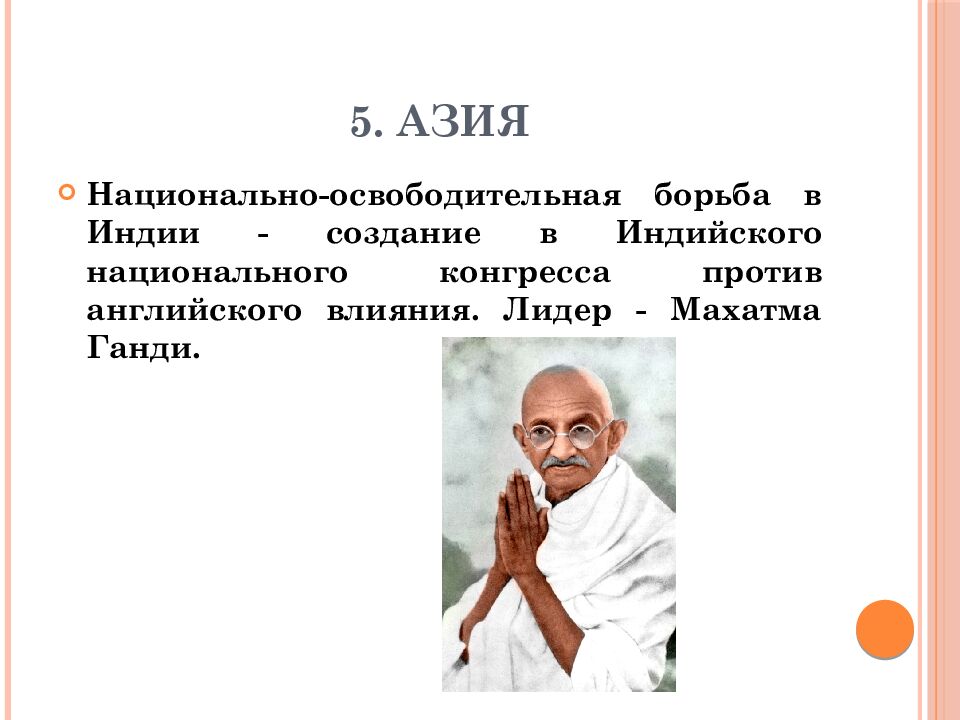 Национально-освободительная борьба в Индии - создание в Индийского национального конгресса против английского влияния. Лидер - Махатма Ганди.