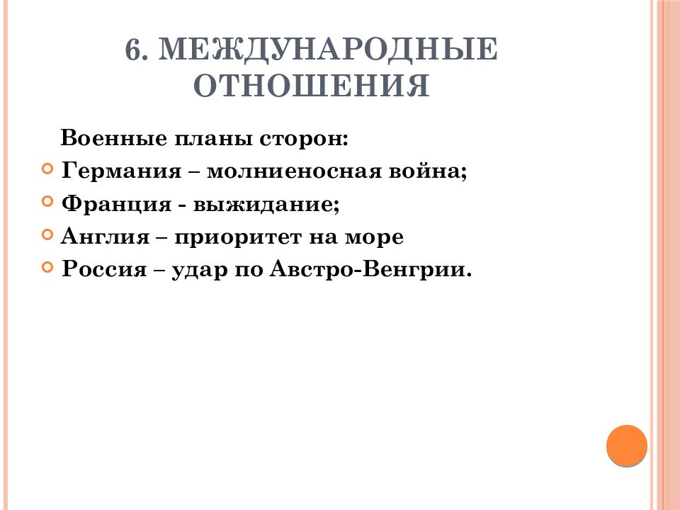 Военные планы сторон: Германия – молниеносная война; Франция - выжидание; Англия – приоритет на море Россия – удар по Австро-Венгрии.