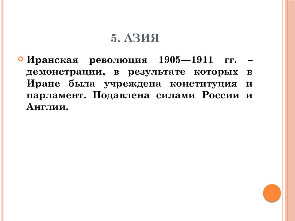 Иранская революция 1905—1911 гг. – демонстрации, в результате которых в Иране была учреждена конституция и парламент. Подавлена силами России и Англии.
