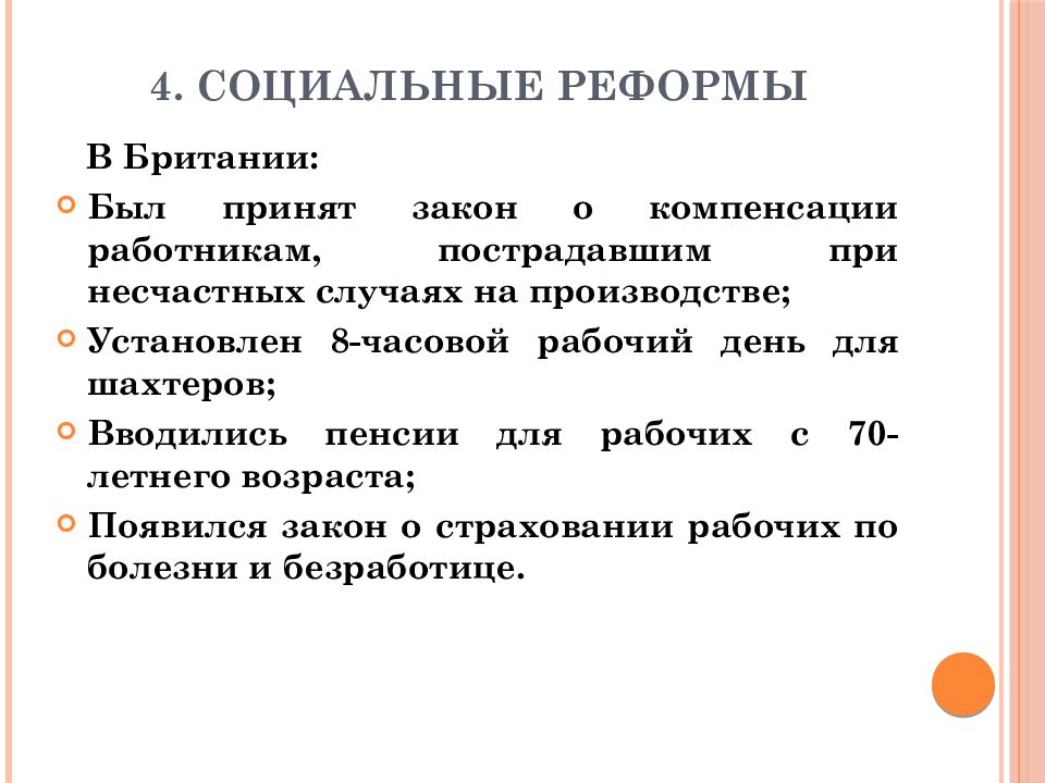 В Британии: Был принят закон о компенсации работникам, пострадавшим при несчастных случаях на производстве; Установлен 8-часовой рабочий день для шахтеров; Вводились пенсии для рабочих с 70-летнего возраста; Появился закон о страховании рабочих по болезни и безработице.