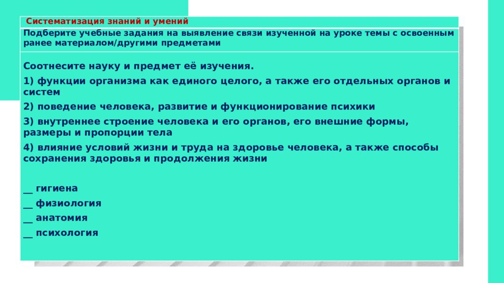 Систематизация знаний и умений Подберите учебные задания на выявление связи изученной на уроке темы с освоенным ранее материалом/другими предметами Соотнесите науку и предмет её изучения. 1) функции организма как единого целого, а также его отдельных органов и систем 2) поведение человека, развитие и функционирование психики 3) внутреннее строение человека и его органов, его внешние формы, размеры и пропорции тела 4) влияние условий жизни и труда на здоровье человека, а также способы сохранения здоровья и продолжения жизни __ гигиена __ физиология __ анатомия __ психология