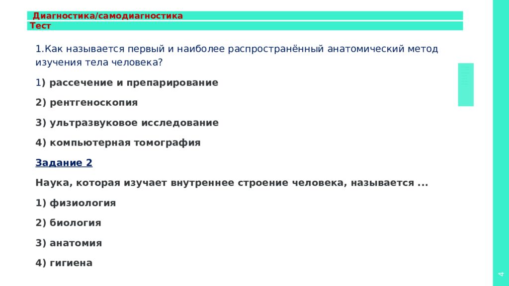 4 Щелкните, чтобы изменить стили текста образца слайда Диагностика/самодиагностика Тест 1.Как называется первый и наиболее распространённый анатомический метод изучения тела человека? 1 ) рассечение и препарирование 2) рентгеноскопия 3) ультразвуковое исследование 4) компьютерная томография Задание 2 Наука, которая изучает внутреннее строение человека, называется... 1) физиология 2) биология 3) анатомия 4) гигиена