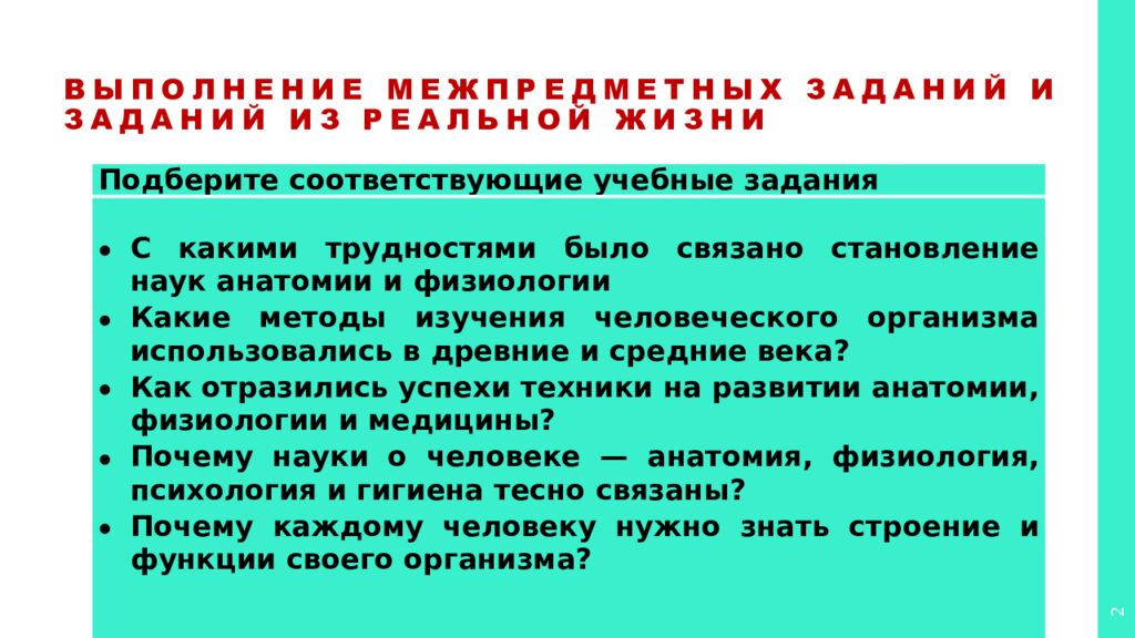 2 Подберите соответствующие учебные задания С какими трудностями было связано становление наук анатомии и физиологии Какие методы изучения человеческого организма использовались в древние и средние века? Как отразились успехи техники на развитии анатомии, физиологии и медицины? Почему науки о человеке — анатомия, физиология, психология и гигиена тесно связаны? Почему каждому человеку нужно знать строение и функции своего организма?