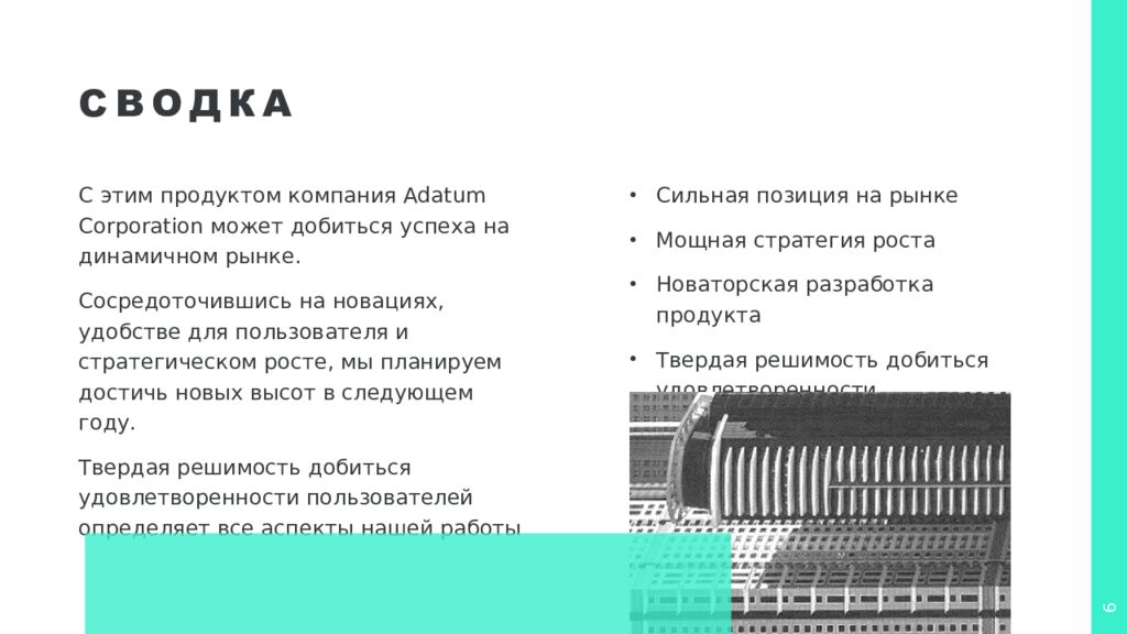 С этим продуктом компания Adatum Corporation может добиться успеха на динамичном рынке. Сосредоточившись на новациях, удобстве для пользователя и стратегическом росте, мы планируем достичь новых высот в следующем году. Твердая решимость добиться удовлетворенности пользователей определяет все аспекты нашей работы Сильная позиция на рынке Мощная стратегия роста Новаторская разработка продукта Твердая решимость добиться удовлетворенности пользователей 6