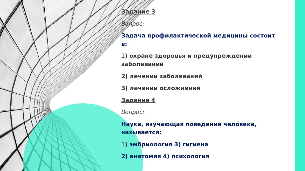 Задание 3 Вопрос: Задача профилактической медицины состоит в: 1 ) охране здоровья и предупреждении заболеваний 2) лечении заболеваний 3) лечении осложнений Задание 4 Вопрос: Наука, изучающая поведение человека, называется: 1 ) эмбриология 3) гигиена 2) анатомия 4) психология
