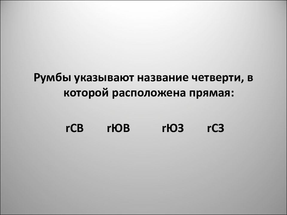 Румбы указывают название четверти, в которой расположена прямая: r СВ r ЮВ r ЮЗ r СЗ