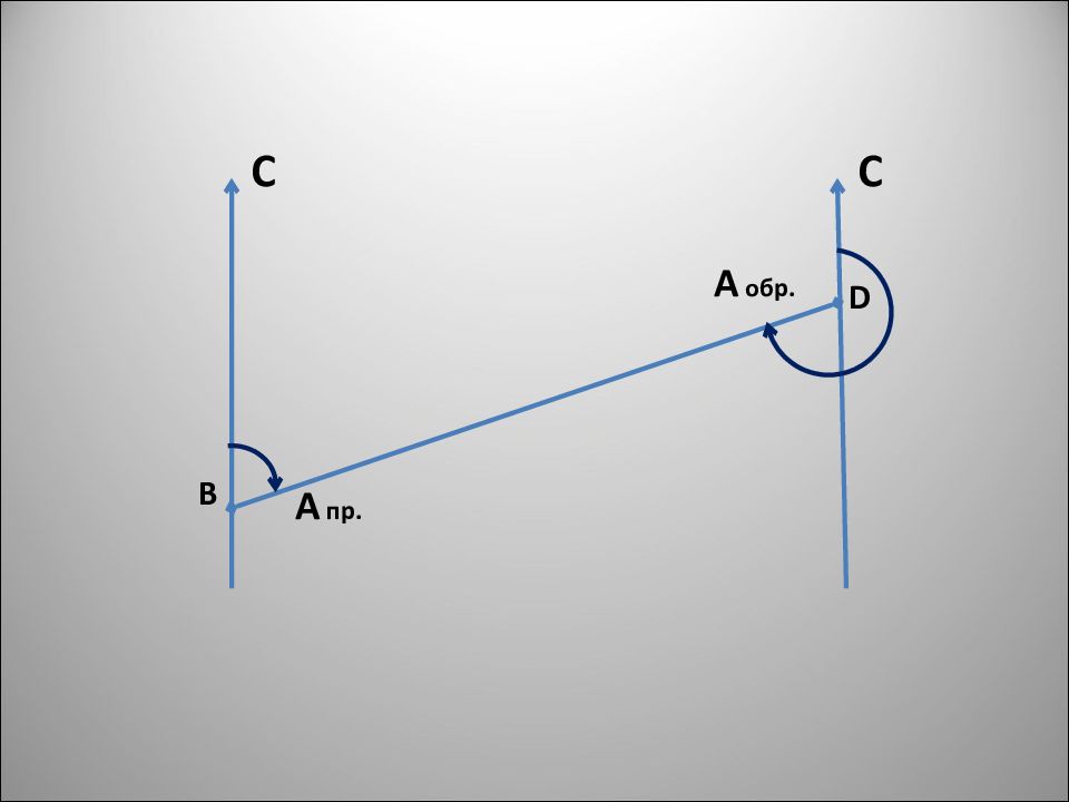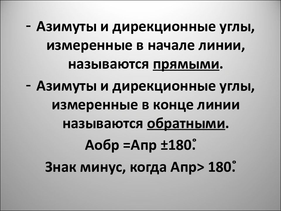 Азимуты и дирекционные углы, измеренные в начале линии, называются прямыми. Азимуты и дирекционные углы, измеренные в конце линии называются обратными. Аобр =Апр ±180˚. Знак минус, когда Апр˃ 180˚.