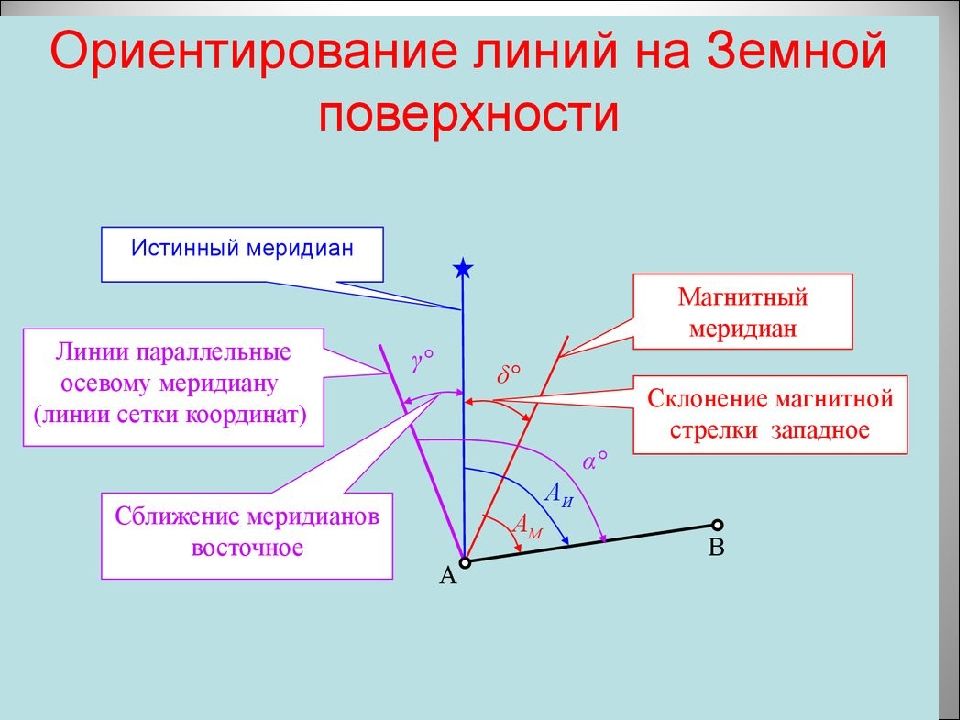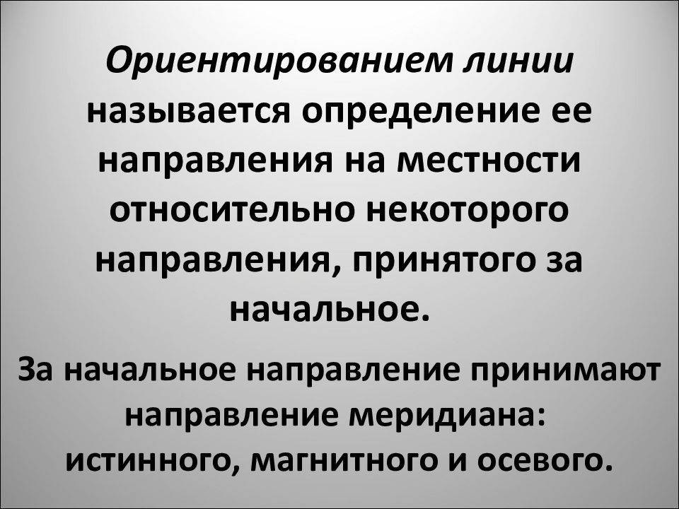 Слайд 4: Ориентированием линии называется определение ее направления на местности относительно некоторого направления, принятого за начальное. За начальное направление принимают направление меридиана: истинного, магнитного и осевого