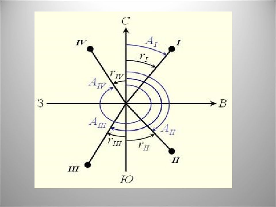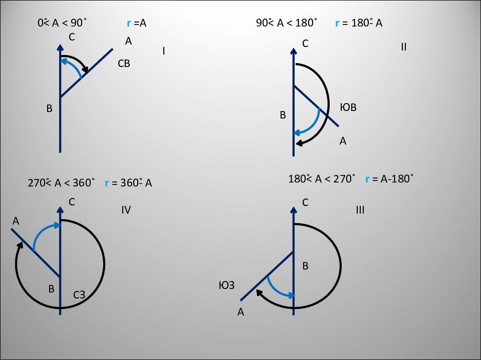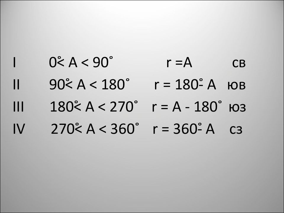 I 0˚˂ А ˂ 90˚ r = А св II 90˚˂ А ˂ 18 0˚ r = 180˚- А юв III 18 0˚˂ А ˂ 270˚ r = А - 180˚ юз IV 270˚˂ А ˂ 36 0˚ r = 360˚- А сз