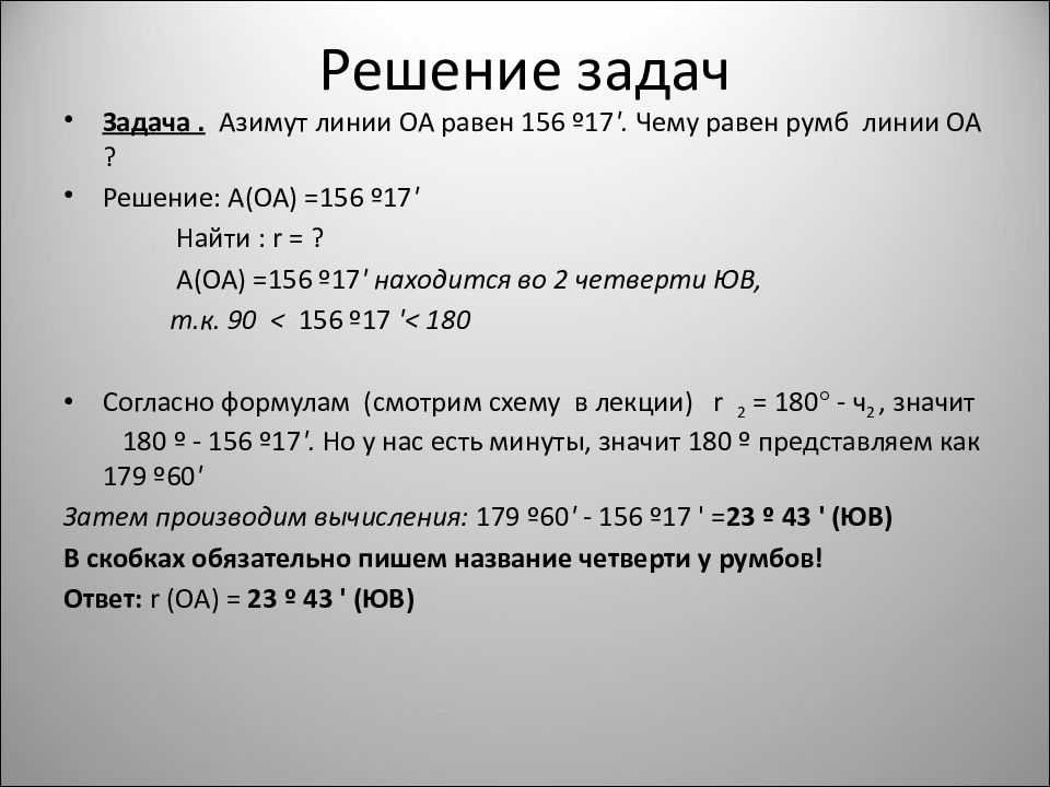 Задача. Азимут линии ОА равен 156 º17 '. Чему равен румб линии ОА ? Решение: А(ОА) =156 º17 ' Найти : r = ? А(ОА) =156 º17 ' находится во 2 четверти ЮВ, т.к. 90 < 156 º17 '< 180 Согласно формулам (смотрим схему в лекции) r 2 = 180 - ч 2, значит 180 º - 156 º17 '. Но у нас есть минуты, значит 180 º представляем как 179 º60 ' Затем производим вычисления: 179 º60 ' - 156 º17 ' = 23 º 43 ' (ЮВ) В скобках обязательно пишем название четверти у румбов! Ответ: r (ОА) = 23 º 43 ' (ЮВ)