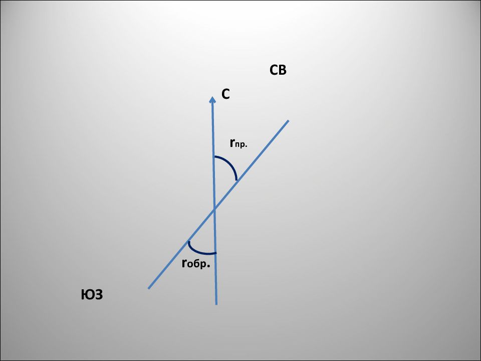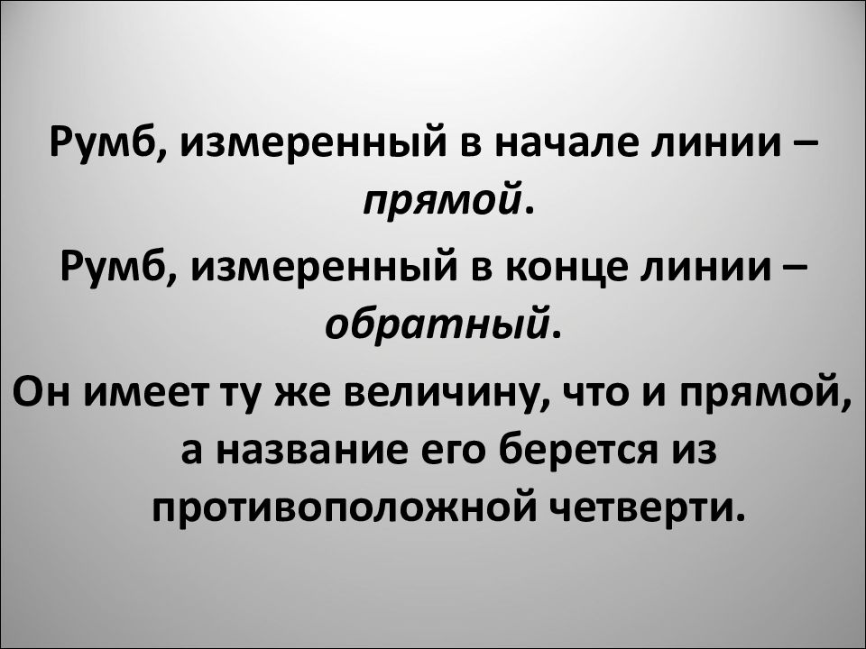 Румб, измеренный в начале линии – прямой. Румб, измеренный в конце линии – обратный. Он имеет ту же величину, что и прямой, а название его берется из противоположной четверти.