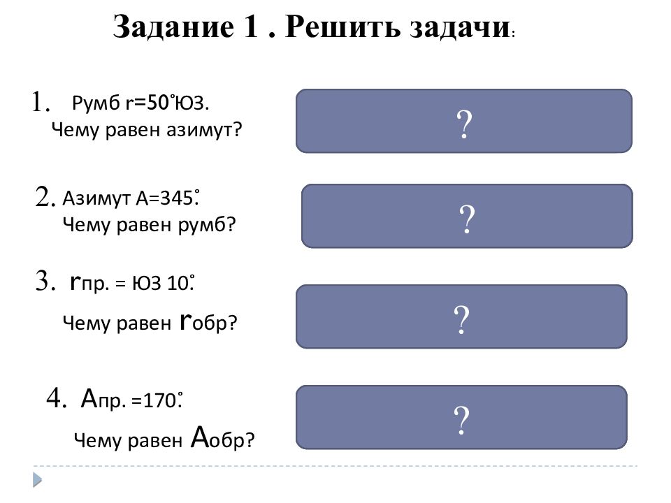 r обр.= СВ 10˚ Румб 15˚ СЗ Азимут =130˚ ? 1. 3. Румб 15˚ СЗ ? Румб r=50 ˚ ЮЗ. Чему равен азимут? Азимут А=345˚. Чему равен румб? 2. r пр. = ЮЗ 10˚. Чему равен r обр? ? Аобр=350˚ r обр.= СВ 10˚ ? 4. А пр. =170˚. Чему равен А обр? Задание 1. Решить задачи :