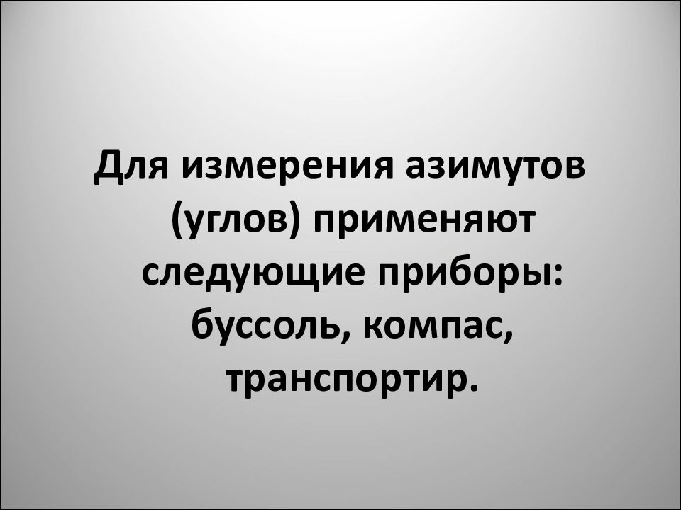 Для измерения азимутов (углов) применяют следующие приборы: буссоль, компас, транспортир.