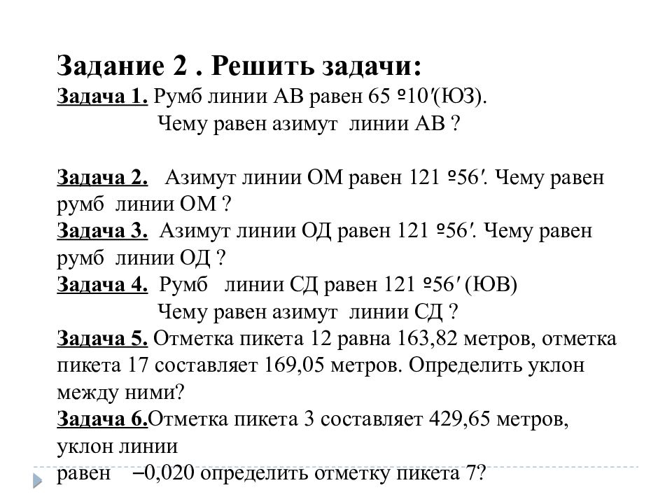 Задание 2. Решить задачи: Задача 1. Румб линии АВ равен 65 º 10 ' (ЮЗ). Чему равен азимут линии АВ ? Задача 2. Азимут линии ОМ равен 121 º 56 '. Чему равен румб линии ОМ ? Задача 3. Азимут линии ОД равен 121 º 56 '. Чему равен румб линии ОД ? Задача 4. Румб линии СД равен 121 º 56 ' (ЮВ) Чему равен азимут линии СД ? Задача 5. Отметка пикета 12 равна 163,82 метров, отметка пикета 17 составляет 169,05 метров. Определить уклон между ними? Задача 6. Отметка пикета 3 составляет 429,65 метров, уклон линии равен – 0,020 определить отметку пикета 7?