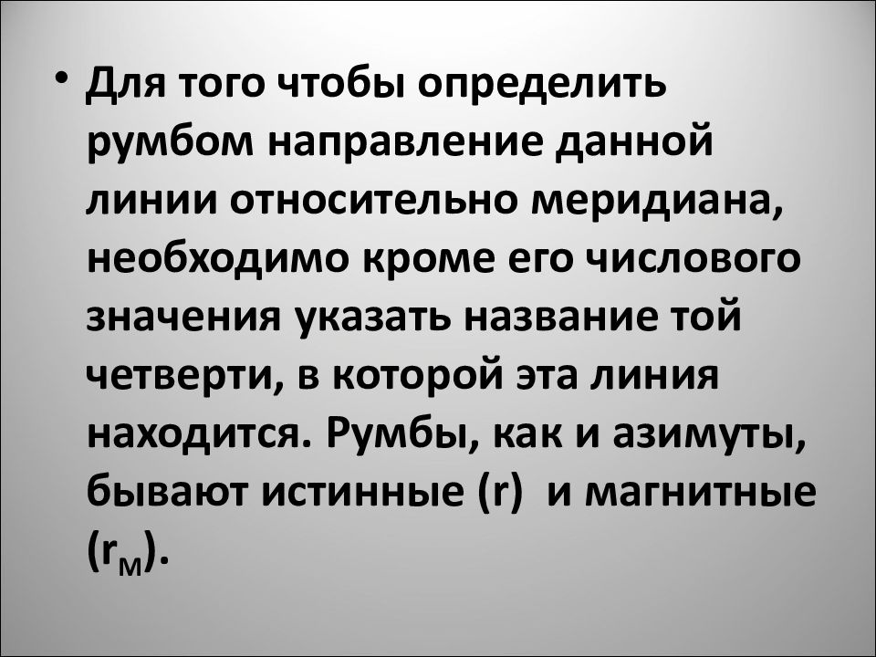 Для того чтобы определить румбом направление данной линии относительно меридиана, необходимо кроме его числового значения указать название той четверти, в которой эта линия находится. Румбы, как и азимуты, бывают истинные (r) и магнитные (r М ).