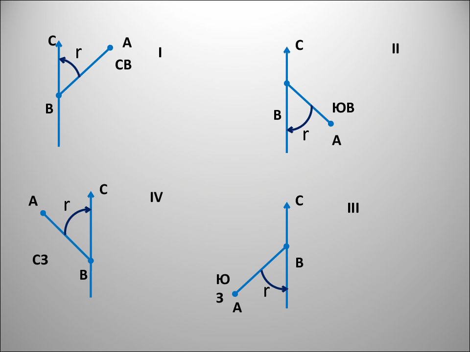 СВ А В С ЮЗ А В С А В С ЮВ А В С I II III IV 0˚˂ А ˂ 90˚ r = А 90˚˂ А ˂ 18 0˚ r = 180˚- А 18 0˚˂ А ˂ 270˚ r = А-180˚ 270˚˂ А ˂ 36 0˚ r = 360˚- А СЗ