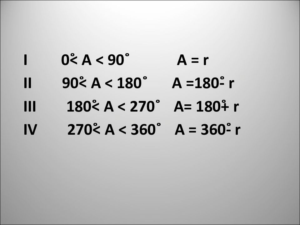 I 0˚˂ А ˂ 90˚ А = r II 90˚˂ А ˂ 18 0˚ А = 18 0˚- r III 18 0˚˂ А ˂ 270˚ А = 180˚+ r IV 270˚˂ А ˂ 36 0˚ А = 360˚- r