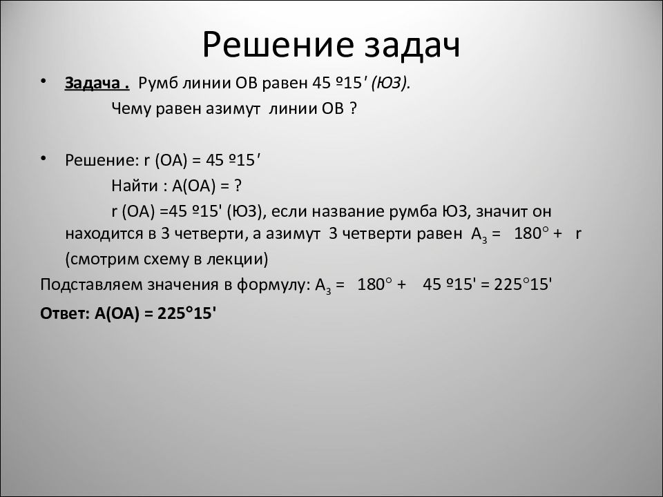Задача. Румб линии ОВ равен 45 º15 ' (ЮЗ). Чему равен азимут линии ОВ ? Решение: r (ОА) = 45 º15 ' Найти : А(ОА) = ? r (ОА) =45 º15' (ЮЗ), если название румба ЮЗ, значит он находится в 3 четверти, а азимут 3 четверти равен А 3 = 180 + r (смотрим схему в лекции) Подставляем значения в формулу: А 3 = 180 + 45 º15' = 225 15' Ответ: А(ОА) = 225 15'