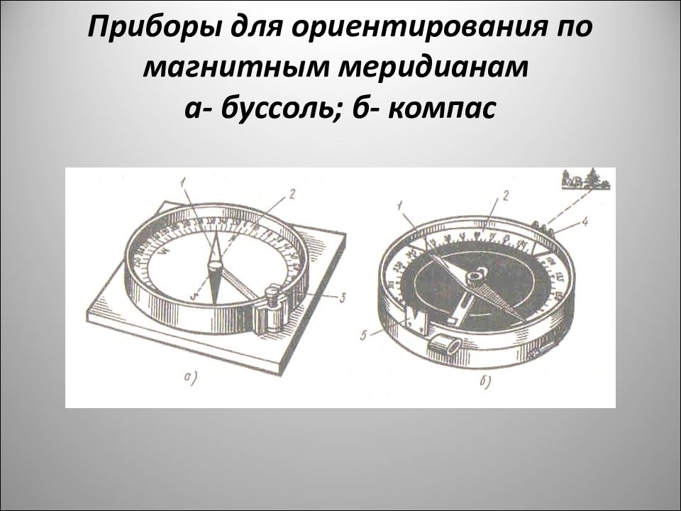 Слайд 27: Приборы для ориентирования по магнитным меридианам а- буссоль; б- компас