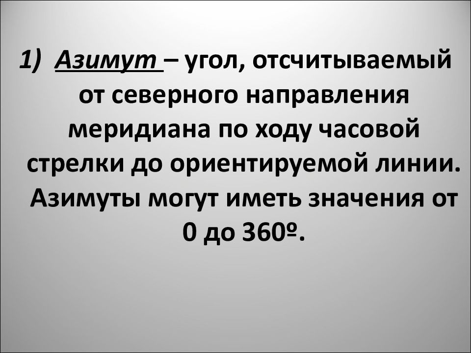 1) Азимут – угол, отсчитываемый от северного направления меридиана по ходу часовой стрелки до ориентируемой линии. Азимуты могут иметь значения от 0 до 360º.