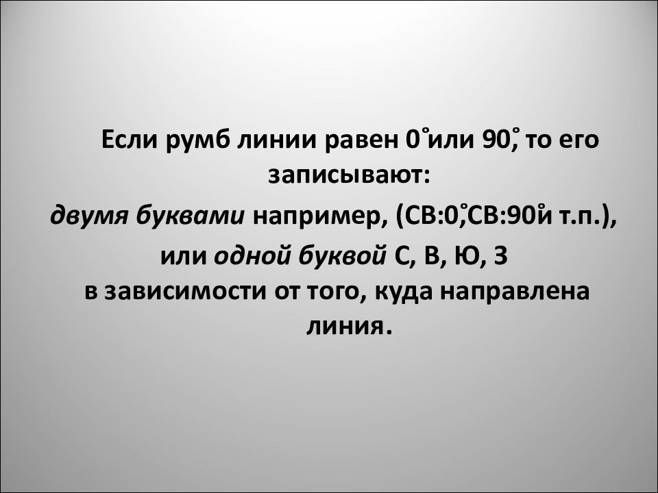 Если румб линии равен 0˚ или 90˚, то его записывают: двумя буквами например, (СВ:0˚,СВ:90˚и т.п.), или одной буквой С, В, Ю, З в зависимости от того, куда направлена линия.