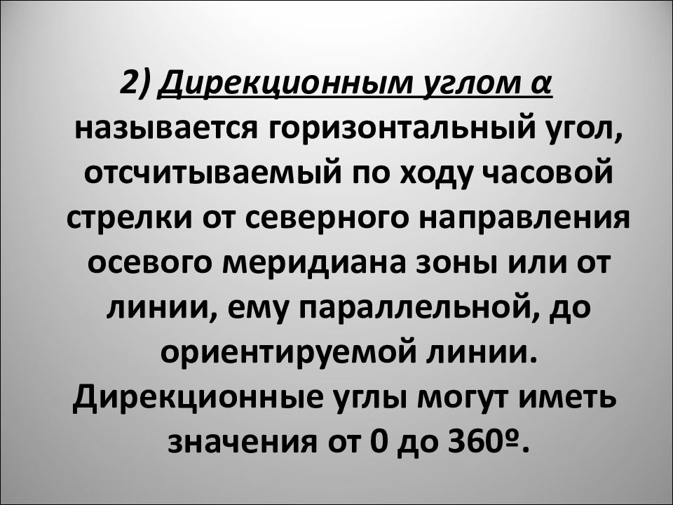 2) Дирекционным углом α называется горизонтальный угол, отсчитываемый по ходу часовой стрелки от северного направления осевого меридиана зоны или от линии, ему параллельной, до ориентируемой линии. Дирекционные углы могут иметь значения от 0 до 360º.