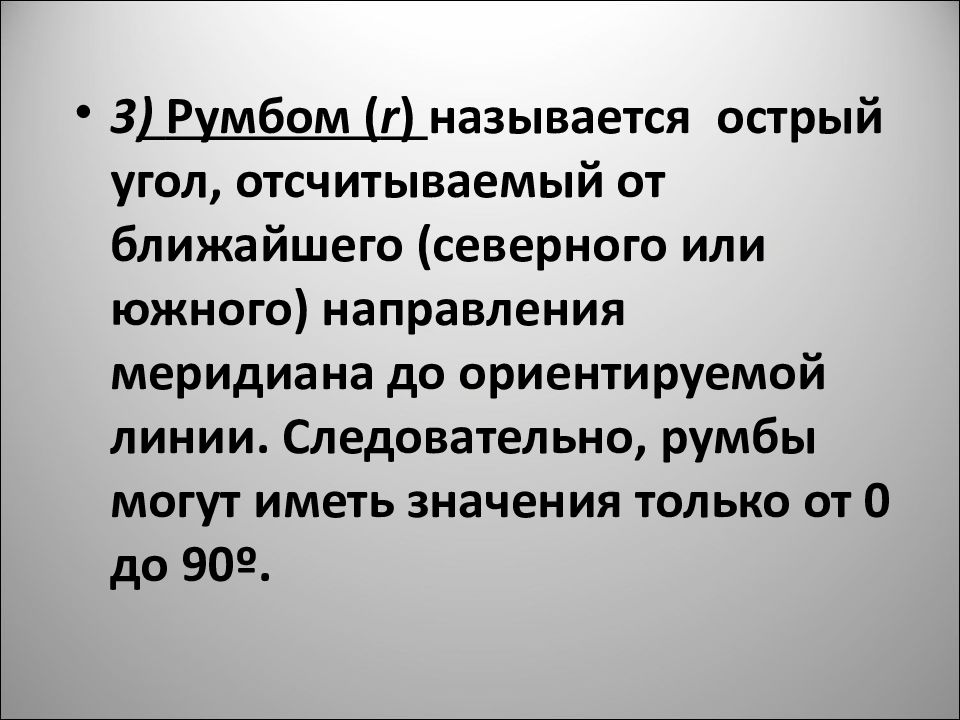 3 ) Румбом ( r ) называется острый угол, отсчитываемый от ближайшего (северного или южного) направления меридиана до ориентируемой линии. Следовательно, румбы могут иметь значения только от 0 до 90º.