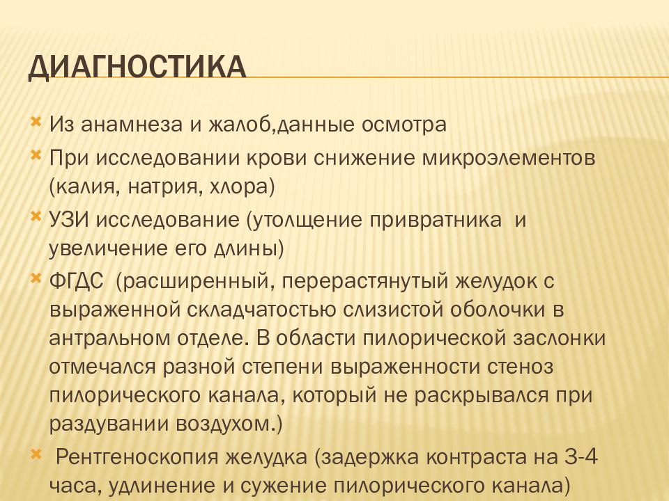 Из анамнеза и жалоб,данные осмотра При исследовании крови снижение микроэлементов (калия, натрия, хлора) УЗИ исследование (утолщение привратника и увеличение его длины) ФГДС (расширенный, перерастянутый желудок с выраженной складчатостью слизистой оболочки в антральном отделе. В области пилорической заслонки отмечался разной степени выраженности стеноз пилорического канала, который не раскрывался при раздувании воздухом.) Рентгеноскопия желудка (задержка контраста на 3-4 часа, удлинение и сужение пилорического канала)