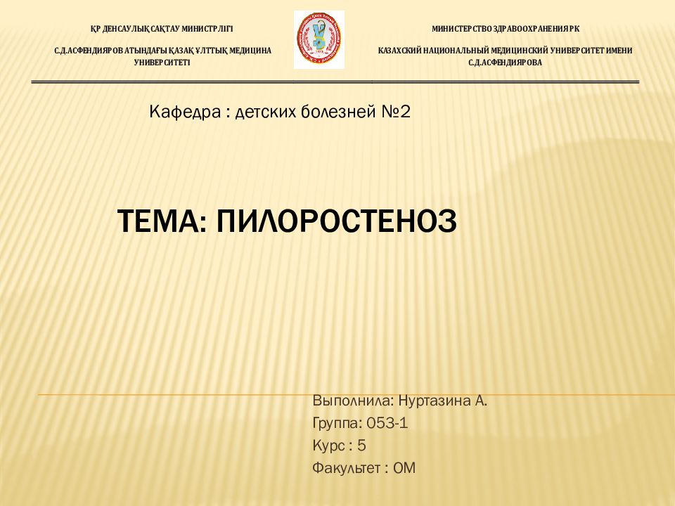 Выполнила: Нуртазина А. Группа: 053-1 Курс : 5 Факультет : ОМ Тема: пилоростеноз Кафедра : детских болезней № 2