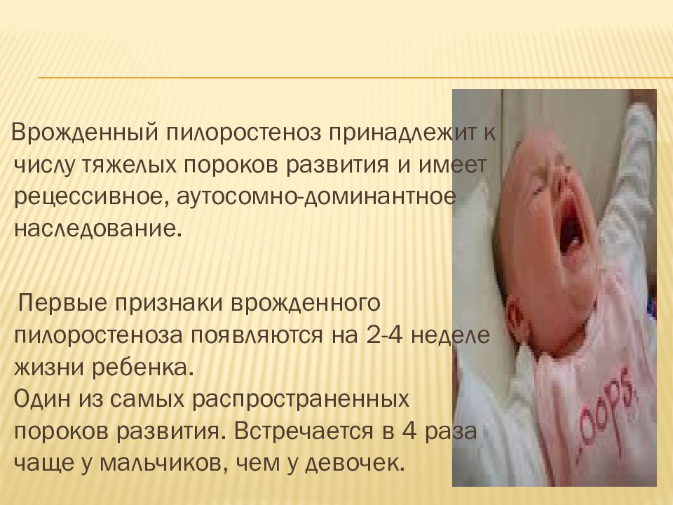 Врожденный пилоростеноз принадлежит к числу тяжелых пороков развития и имеет рецессивное, аутосомно-доминантное наследование. Первые признаки врожденного пилоростеноза появляются на 2-4 неделе жизни ребенка. Один из самых распространенных пороков развития. Встречается в 4 раза чаще у мальчиков, чем у девочек.