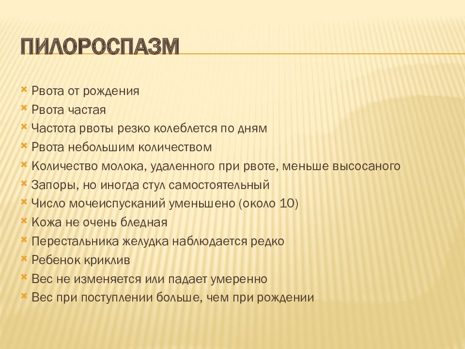 Рвота от рождения Рвота частая Частота рвоты резко колеблется по дням Рвота небольшим количеством Количество молока, удаленного при рвоте, меньше высосаного Запоры, но иногда стул самостоятельный Число мочеиспусканий уменьшено (около 10) Кожа не очень бледная Перестальника желудка наблюдается редко Ребенок криклив Вес не изменяется или падает умеренно Вес при поступлении больше, чем при рождении