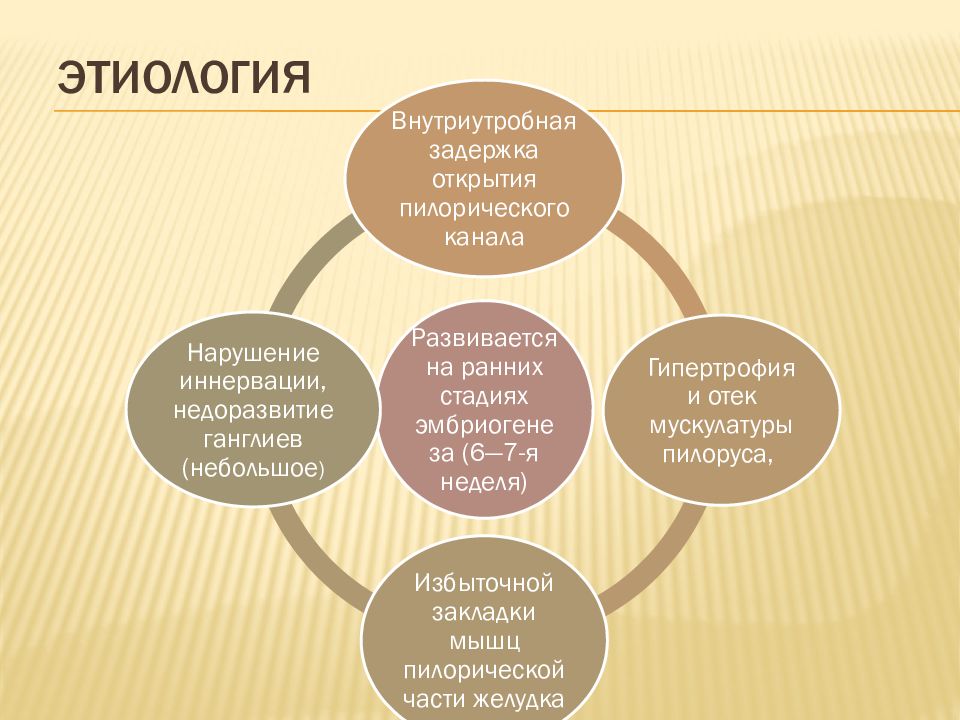 В основе заболевания лежит врожденное нарушение морфологических структур пилорического жома желудка в результате разрастания циркулярного мышечного слоя и межуточной ткани, приводящие к стенозу привратника и нарушению проходимости в данном отделе желудочно-кишечного тракта).