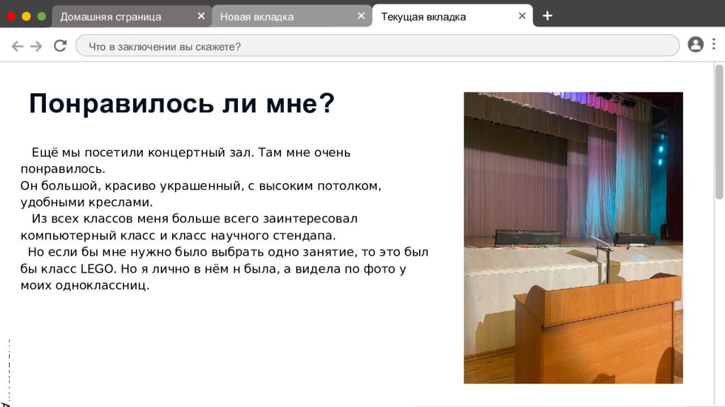 Домашняя страница Новая вкладка Текущая вкладка Что в заключении вы скажете? Ещё мы посетили концертный зал. Там мне очень понравилось. Он большой, красиво украшенный, с высоким потолком, удобными креслами. Из всех классов меня больше всего заинтересовал компьютерный класс и класс научного стендапа. Но если бы мне нужно было выбрать одно занятие, то это был бы класс LEGO. Но я лично в нём н была, а видела по фото у моих одноклассниц. . Понравилось ли мне?