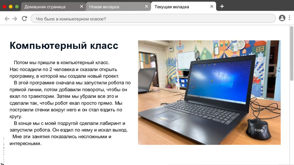 Потом мы пришли в компьютерный класс. Нас посадили по 2 человека и сказали открыть программу, в которой мы создали новый проект. В этой программе сначала мы запустили робота по прямой линии, потом добавили повороты, чтобы он ехал по траектории. Затем мы убрали все это и сделали так, чтобы робот ехал просто прямо. Мы построили стенки вокруг него и он стал ездить по кругу. В конце мы с моей подругой сделали лабиринт и запустили робота. Он ездил по нему и искал выход. Мне эти занятия показались несложными и интересными. Домашняя страница Новая вкладка Текущая вкладка Что было в компьютерном классе? Компьютерный класс