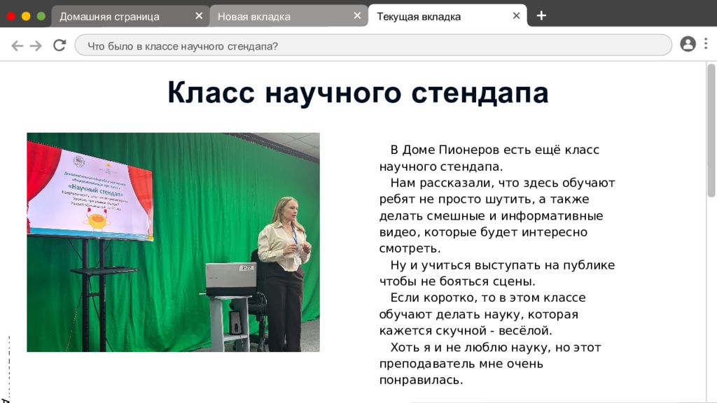 В Доме Пионеров есть ещё класс научного стендапа. Нам рассказали, что здесь обучают ребят не просто шутить, а также делать смешные и информативные видео, которые будет интересно смотреть. Ну и учиться выступать на публике чтобы не бояться сцены. Если коротко, то в этом классе обучают делать науку, которая кажется скучной - весёлой. Хоть я и не люблю науку, но этот преподаватель мне очень понравилась. Домашняя страница Новая вкладка Текущая вкладка Что было в классе научного стендапа? Класс научного стендапа