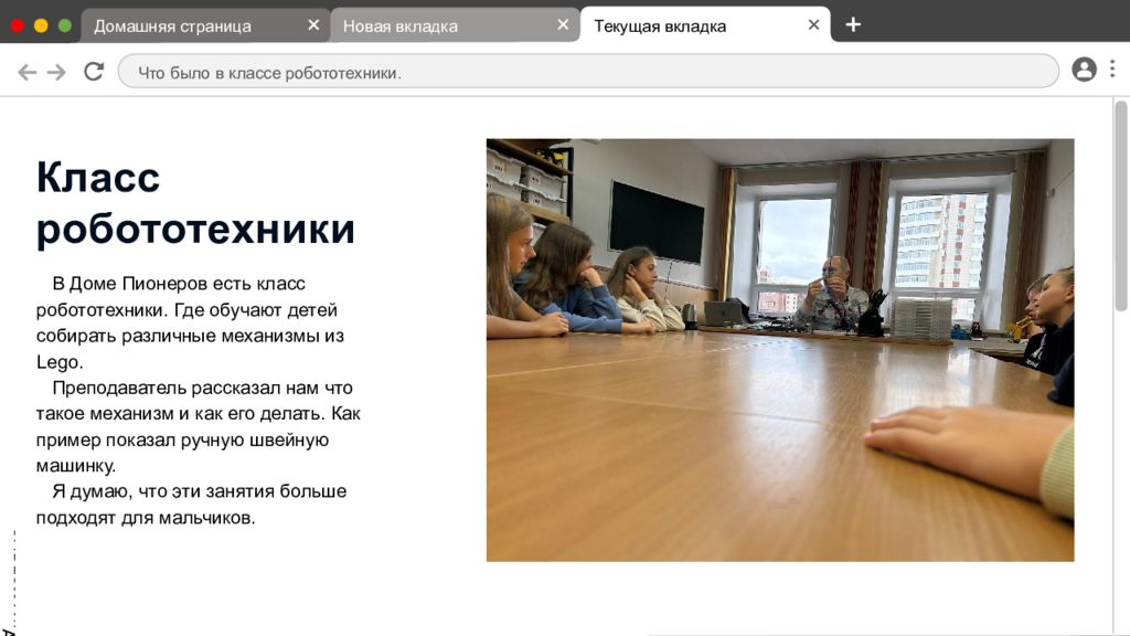 В Доме Пионеров есть класс робототехники. Где обучают детей собирать различные механизмы из Lego. Преподаватель рассказал нам что такое механизм и как его делать. Как пример показал ручную швейную машинку. Я думаю, что эти занятия больше подходят для мальчиков. Домашняя страница Новая вкладка Текущая вкладка Что было в классе робототехники. Класс робототехники