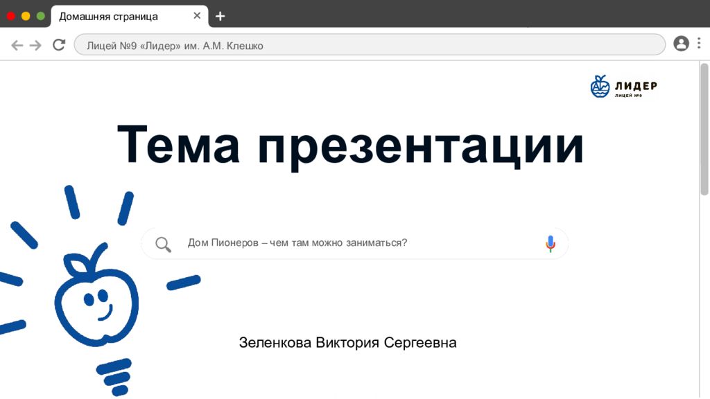 Дом Пионеров – чем там можно заниматься? Домашняя страница Лицей №9 «Лидер» им. А.М. Клешко Тема презентации Зеленкова Виктория Сергеевна