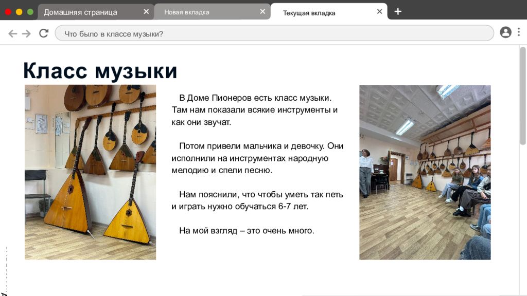 В Доме Пионеров есть класс музыки. Там нам показали всякие инструменты и как они звучат. Потом привели мальчика и девочку. Они исполнили на инструментах народную мелодию и спели песню. Нам пояснили, что чтобы уметь так петь и играть нужно обучаться 6-7 лет. На мой взгляд – это очень много. Домашняя страница Что было в классе музыки? Новая вкладка Текущая вкладка Класс музыки