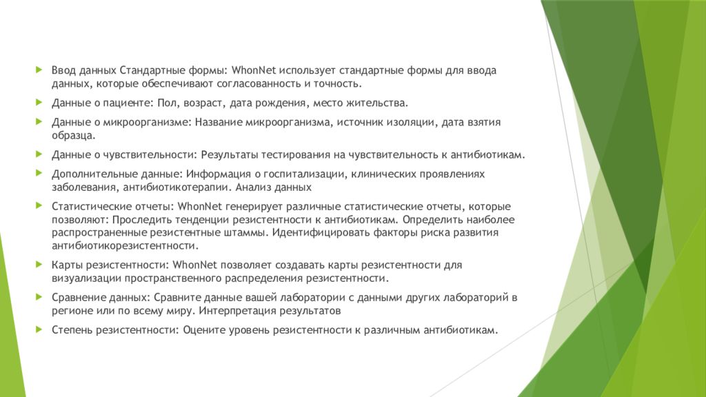 Ввод данных Стандартные формы: WhonNet использует стандартные формы для ввода данных, которые обеспечивают согласованность и точность. Данные о пациенте: Пол, возраст, дата рождения, место жительства. Данные о микроорганизме: Название микроорганизма, источник изоляции, дата взятия образца. Данные о чувствительности: Результаты тестирования на чувствительность к антибиотикам. Дополнительные данные: Информация о госпитализации, клинических проявлениях заболевания, антибиотикотерапии. Анализ данных Статистические отчеты: WhonNet генерирует различные статистические отчеты, которые позволяют: Проследить тенденции резистентности к антибиотикам. Определить наиболее распространенные резистентные штаммы. Идентифицировать факторы риска развития антибиотикорезистентности. Карты резистентности: WhonNet позволяет создавать карты резистентности для визуализации пространственного распределения резистентности. Сравнение данных: Сравните данные вашей лаборатории с данными других лабораторий в регионе или по всему миру. Интерпретация результатов Степень резистентности: Оцените уровень резистентности к различным антибиотикам.
