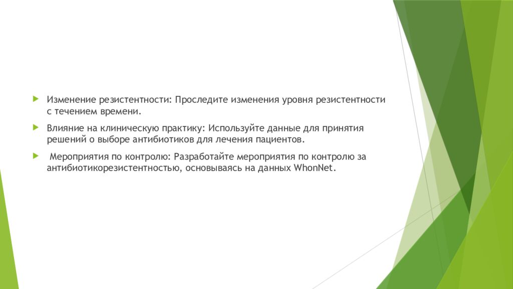 Изменение резистентности: Проследите изменения уровня резистентности с течением времени. Влияние на клиническую практику: Используйте данные для принятия решений о выборе антибиотиков для лечения пациентов. Мероприятия по контролю: Разработайте мероприятия по контролю за антибиотикорезистентностью, основываясь на данных WhonNet.