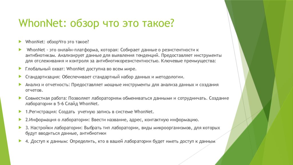 WhonNet : обзорЧто это такое ? WhonNet - это онлайн-платформа, которая : Собирает данные о резистентности к антибиотикам. Анализирует данные для выявления тенденций. Предоставляет инструменты для отслеживания и контроля за антибиотикорезистентностью. Ключевые преимущества : Глобальный охват: WhonNet доступна во всем мире. Стандартизация : Обеспечивает стандартный набор данных и методологии. Анализ и отчетность: Предоставляет мощные инструменты для анализа данных и создания отчетов. Совместная работа: Позволяет лабораториям обмениваться данными и сотрудничать. Создание лаборатории в 5-6 Слайд WhonNet. 1.Регистрация : Создать учетную запись в системе WhonNet. 2.Информация о лаборатории: Ввести название, адрес, контактную информацию. 3. Настройки лаборатории: Выбрать тип лаборатории, виды микроорганизмов, для которых будут вводиться данные, антибиотики 4. Доступ к данным: Определить, кто в вашей лаборатории будет иметь доступ к данным