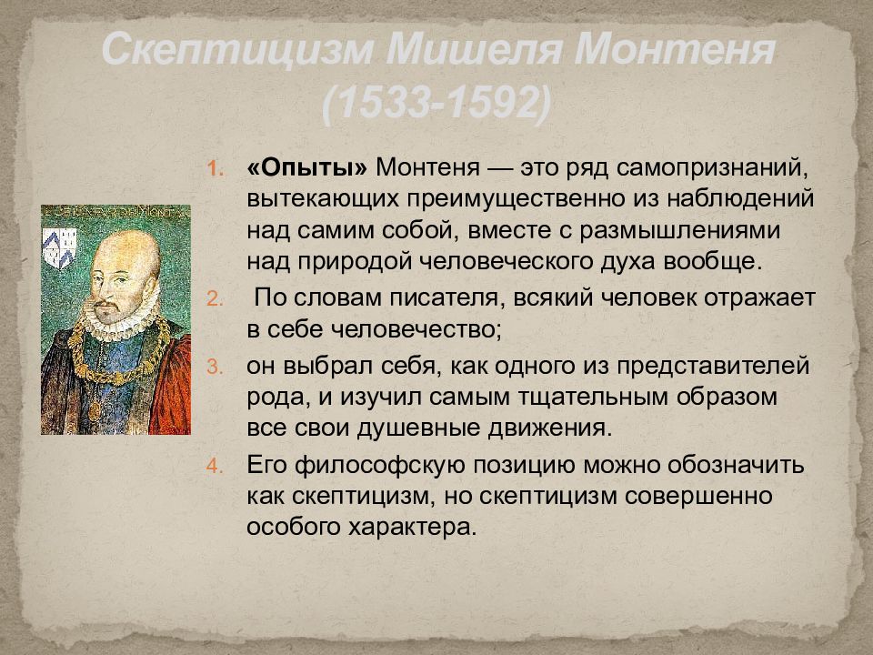 «Опыты» Монтеня — это ряд самопризнаний, вытекающих преимущественно из наблюдений над самим собой, вместе с размышлениями над природой человеческого духа вообще. По словам писателя, всякий человек отражает в себе человечество; он выбрал себя, как одного из представителей рода, и изучил самым тщательным образом все свои душевные движения. Его философскую позицию можно обозначить как скептицизм, но скептицизм совершенно особого характера.