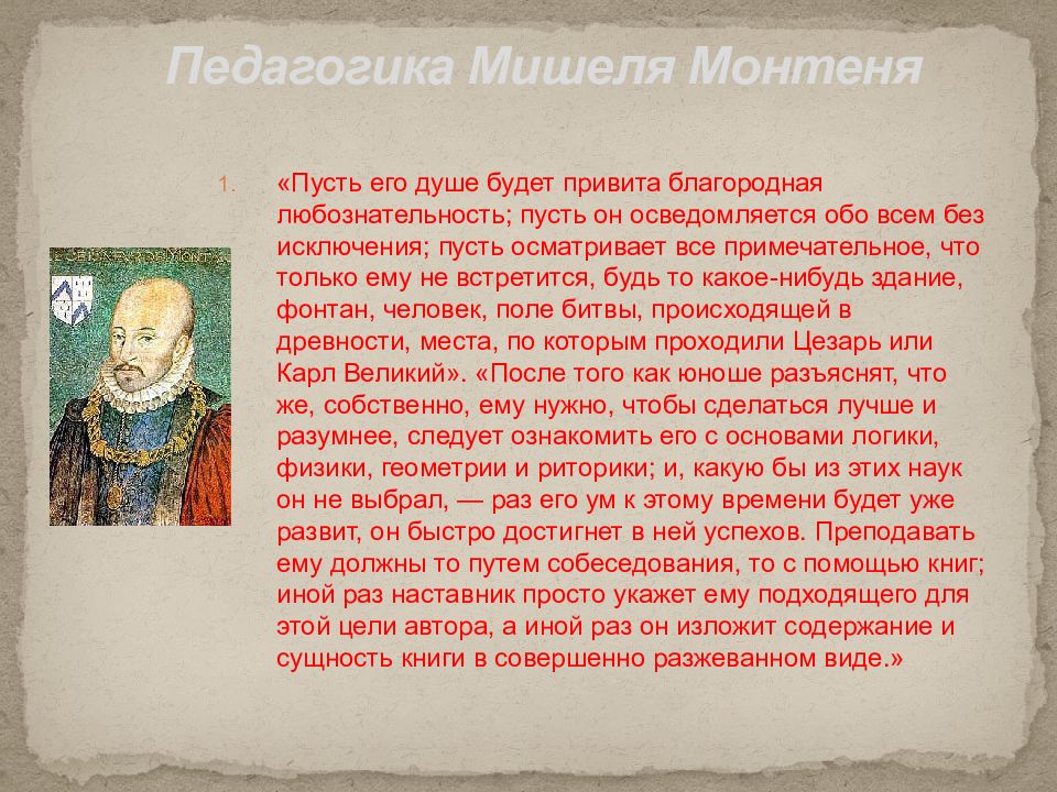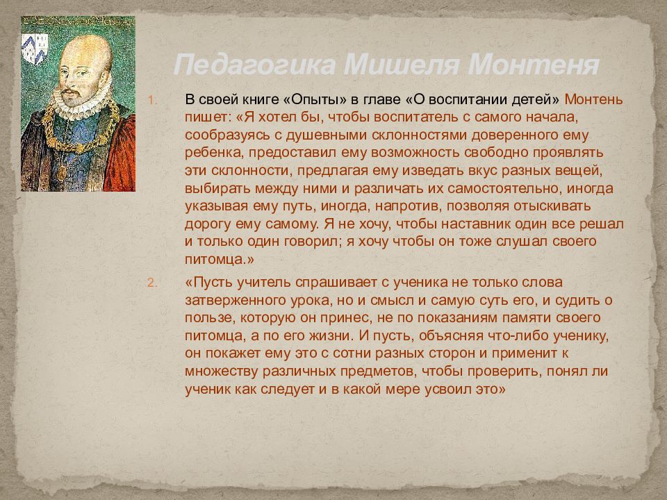 В своей книге «Опыты» в главе «О воспитании детей» Монтень пишет: «Я хотел бы, чтобы воспитатель с самого начала, сообразуясь с душевными склонностями доверенного ему ребенка, предоставил ему возможность свободно проявлять эти склонности, предлагая ему изведать вкус разных вещей, выбирать между ними и различать их самостоятельно, иногда указывая ему путь, иногда, напротив, позволяя отыскивать дорогу ему самому. Я не хочу, чтобы наставник один все решал и только один говорил; я хочу чтобы он тоже слушал своего питомца.» «Пусть учитель спрашивает с ученика не только слова затверженного урока, но и смысл и самую суть его, и судить о пользе, которую он принес, не по показаниям памяти своего питомца, а по его жизни. И пусть, объясняя что-либо ученику, он покажет ему это с сотни разных сторон и применит к множеству различных предметов, чтобы проверить, понял ли ученик как следует и в какой мере усвоил это»