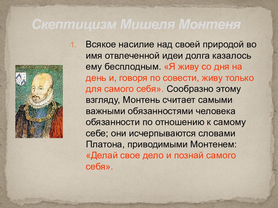 Всякое насилие над своей природой во имя отвлеченной идеи долга казалось ему бесплодным. «Я живу со дня на день и, говоря по совести, живу только для самого себя». Сообразно этому взгляду, Монтень считает самыми важными обязанностями человека обязанности по отношению к самому себе; они исчерпываются словами Платона, приводимыми Монтенем: «Делай свое дело и познай самого себя».