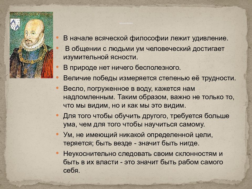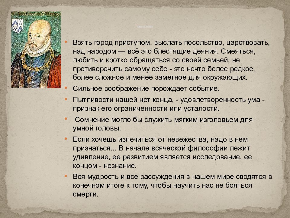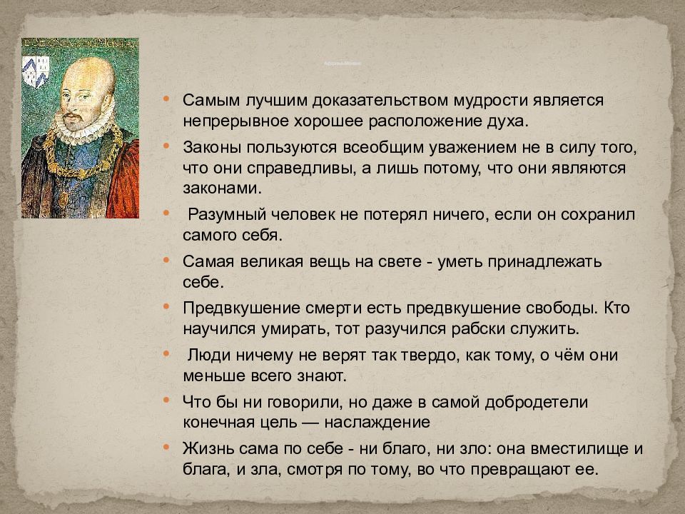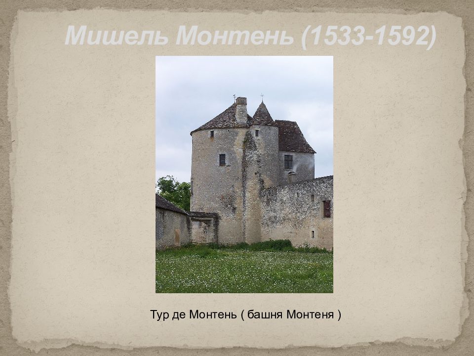 Мишель Экем де Монтень ( Michel Eyquem de Montaigne ) Дата рождения 28 февраля 1533 Место рождения замок Монтень (Сен-Мишель-де-Монтень) Дата смерти 13 сентября 1592 (59 лет) Место смерти Бордо Получил прекрасное образование дома, затем окончил колледж и стал юристом. Монтень сообщает о себе, что дважды был мэром Бордо. Знаменитый французский писатель и философ эпохи Возрождения, автор книги «Опыты».