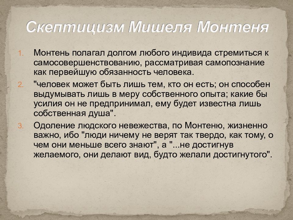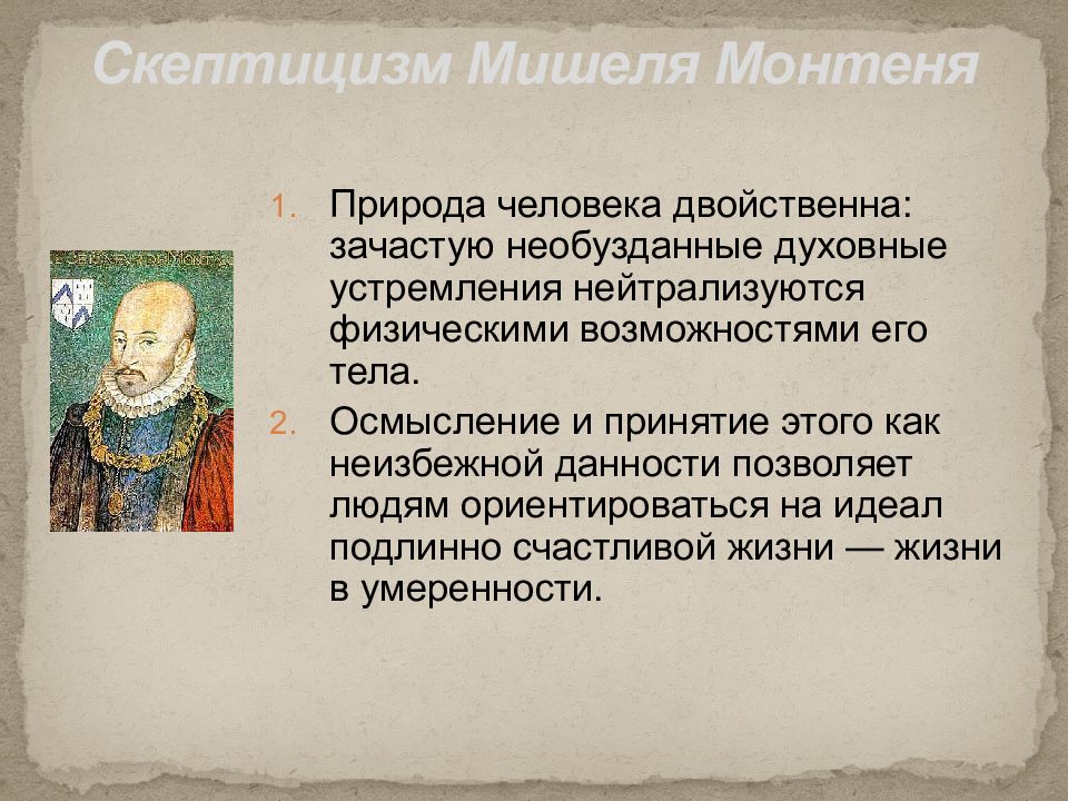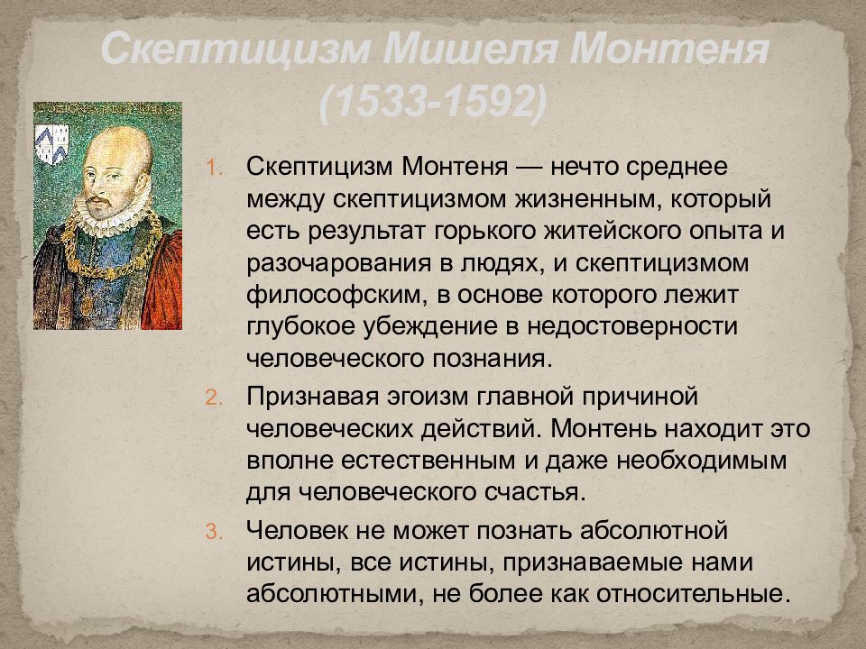 Скептицизм Монтеня — нечто среднее между скептицизмом жизненным, который есть результат горького житейского опыта и разочарования в людях, и скептицизмом философским, в основе которого лежит глубокое убеждение в недостоверности человеческого познания. Признавая эгоизм главной причиной человеческих действий. Монтень находит это вполне естественным и даже необходимым для человеческого счастья. Человек не может познать абсолютной истины, все истины, признаваемые нами абсолютными, не более как относительные.