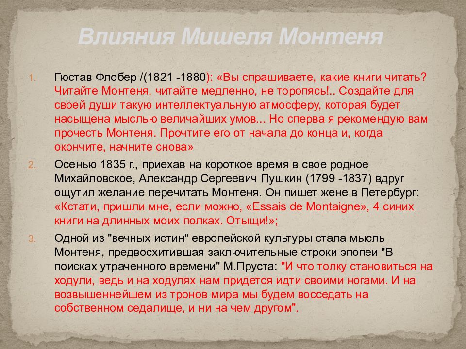 Гюстав Флобер /(1821 -1880 ): «Вы спрашиваете, какие книги читать? Читайте Монтеня, читайте медленно, не торопясь!.. Создайте для своей души такую интеллектуальную атмосферу, которая будет насыщена мыслью величайших умов... Но сперва я рекомендую вам прочесть Монтеня. Прочтите его от начала до конца и, когда окончите, начните снова» Осенью 1835 г., приехав на короткое время в свое родное Михайловское, Александр Сергеевич Пушкин (1799 -1837) вдруг ощутил желание перечитать Монтеня. Он пишет жене в Петербург: «Кстати, пришли мне, если можно, «Essais de Montaigne», 4 синих книги на длинных моих полках. Отыщи!»; Одной из "вечных истин" европейской культуры стала мысль Монтеня, предвосхитившая заключительные строки эпопеи "В поисках утраченного времени" М.Пруста: "И что толку становиться на ходули, ведь и на ходулях нам придется идти своими ногами. И на возвышеннейшем из тронов мира мы будем восседать на собственном седалище, и ни на чем другом".