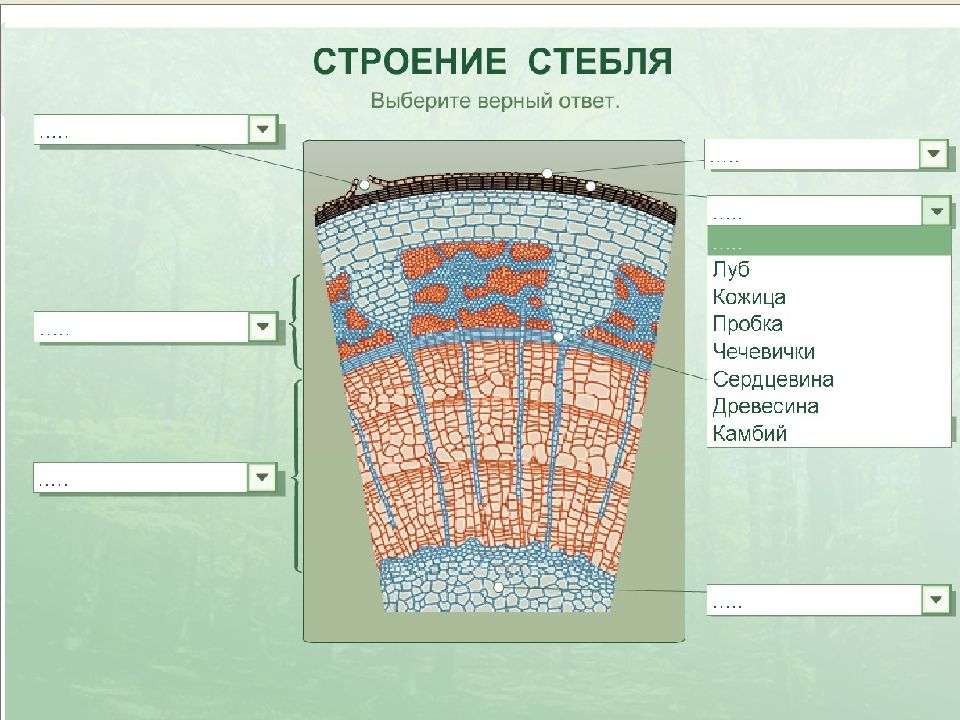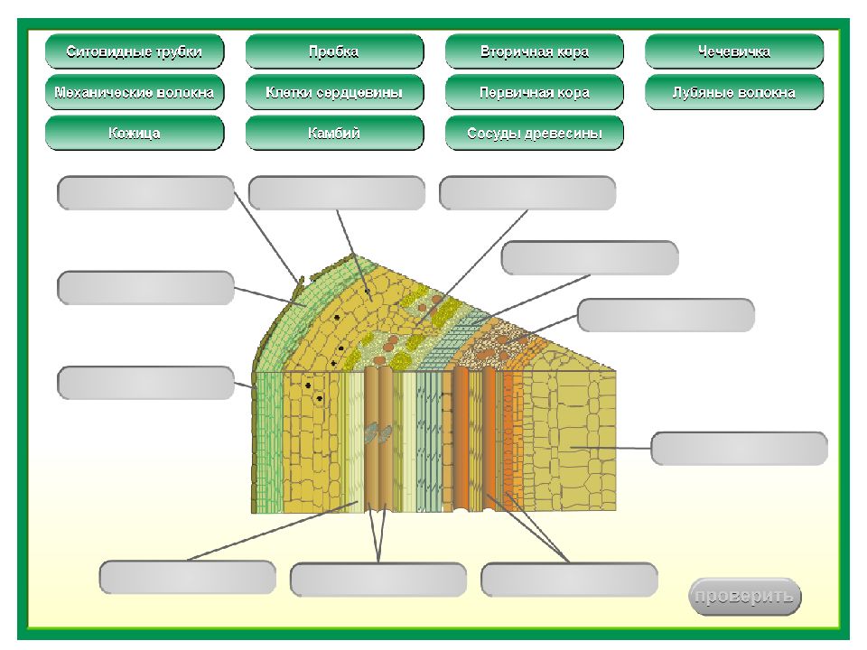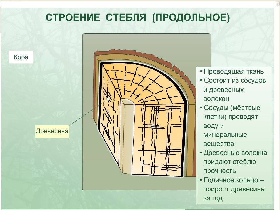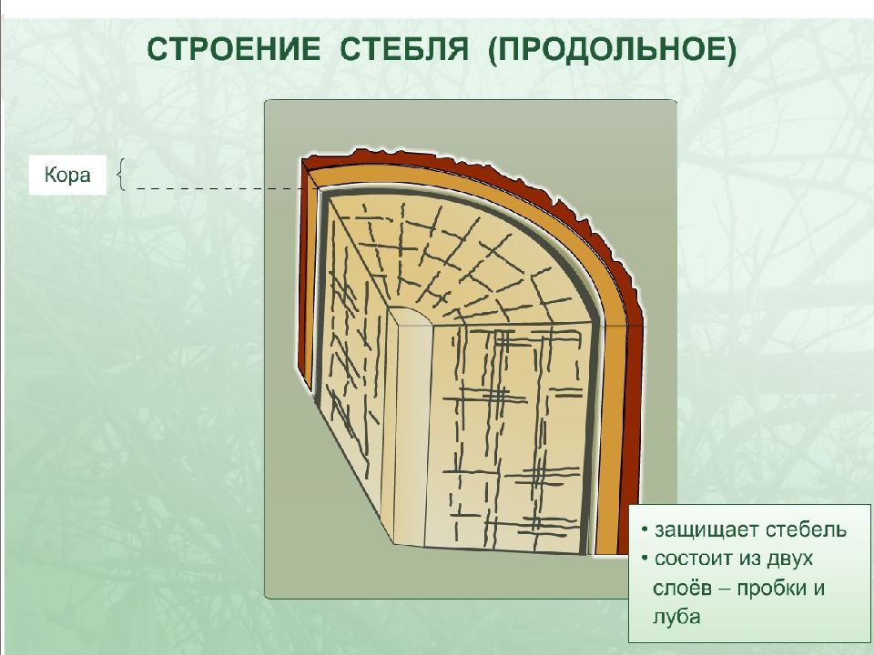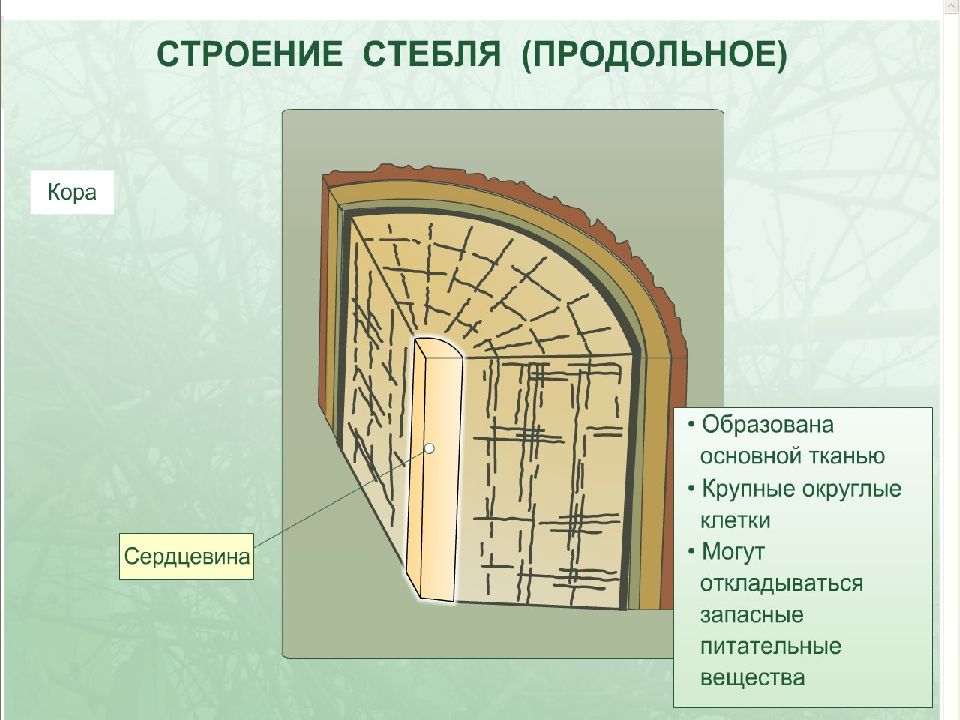(стр.38) Сосуды Камбий Луб Чечевички Кожица Пробка Волокна Сердцевидные лучи Древесина 10 - Сердцевина