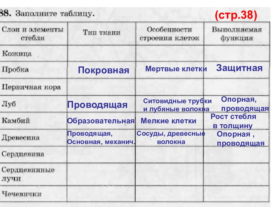 (стр.38) Покровная Мертвые клетки Защитная Проводящая механическая Ситовидные трубки и лубяные волокна Опорная, проводящая Образовательная Мелкие клетки Рост стебля в толщину Проводящая, Основная, механич. Сосуды, древесные волокна Опорная, проводящая Основная Крупные клетки Запасающая Основная Живые клетки Запасающая, проводящая